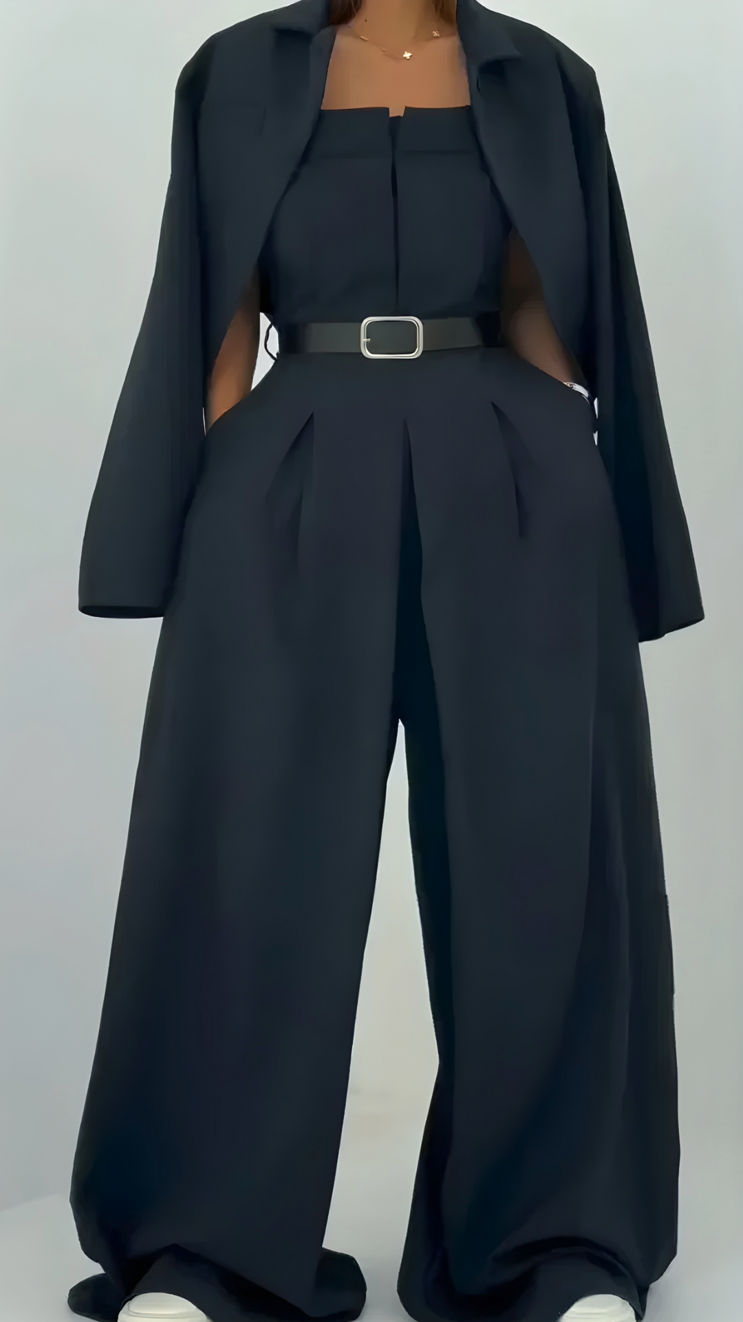 Avec son pantalon ultra tendance et large, son bustier structuré et sa veste fluide assortie, cet ensemble est conçu pour mettre en valeur toutes les silhouettes.